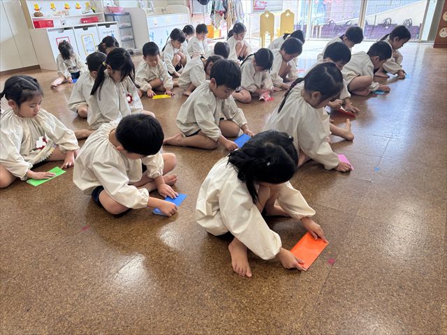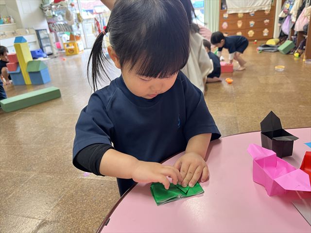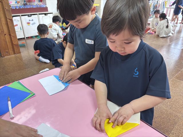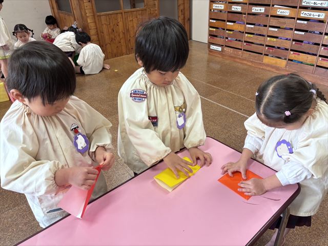 「おうちに帰って年の数だけ豆を入れて食べてね」と豆を入れる『三方』を持ち帰っております。パンダ組のお友だちも自分でできるところまで頑張って折りました。