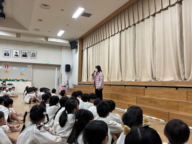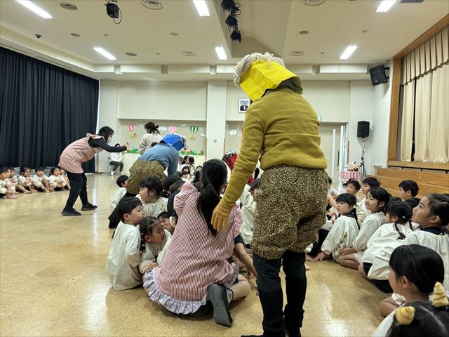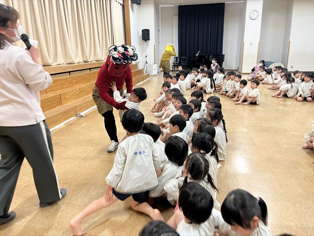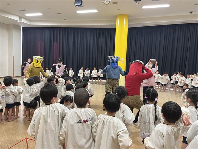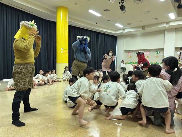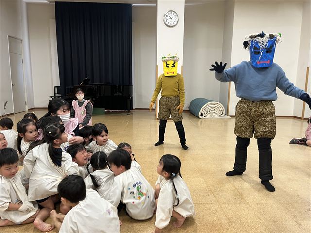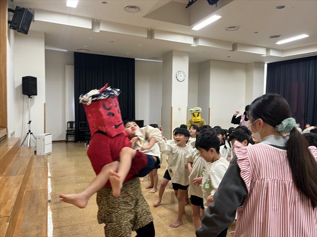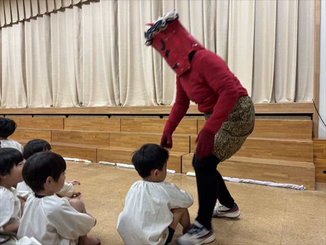今日は豆まき会。遊戯室に幼稚園のお友だちが集まると、豆まき会が始まりました。副園長先生から、昔は一年の始まり(『立春』)を意味する大切な日として邪気を払い、一年間の健康と幸福を願うことが『節分』の豆まきで、豆をまく意味も聞きました。話を聞き終わると太鼓の音が聞こえてきて・・・どこからかきたのでしょうか?!鬼たちが現れました!