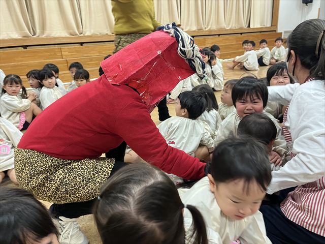 必死に豆を投げるお友だち、「こわくないよ全然!」と話しながらも逃げるお友だち、泣いて先生に抱き着いたり先生の後ろに隠れるお友だちもいましたが無事に退治することができました‼