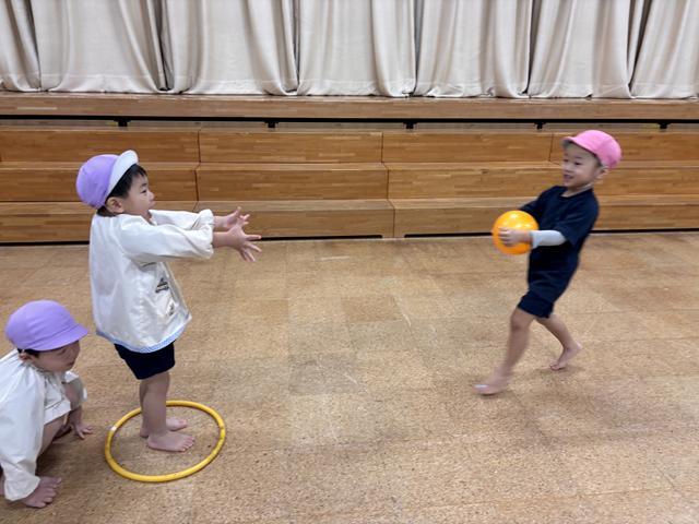 <ゴロゴロドカン> 「ドカン!」の時にボールを持っていたお友だちが先生のところに速く持ってきたチームの勝ち