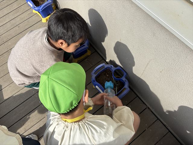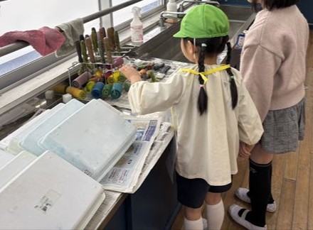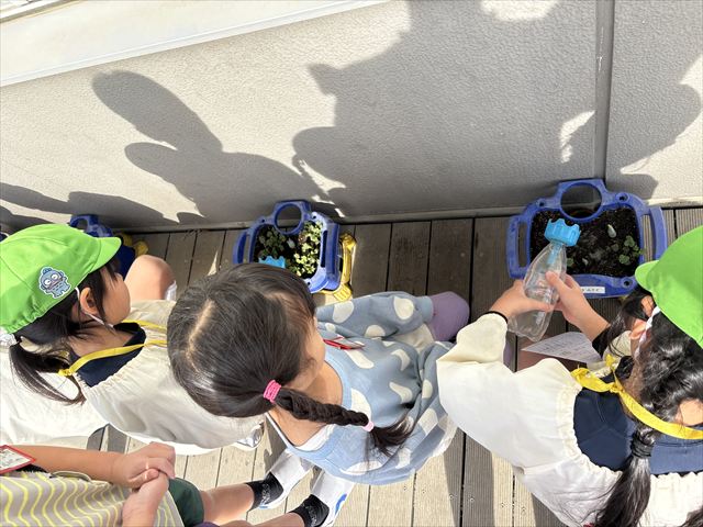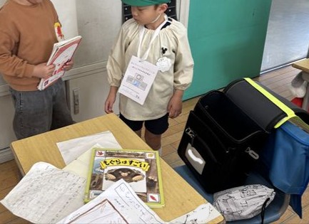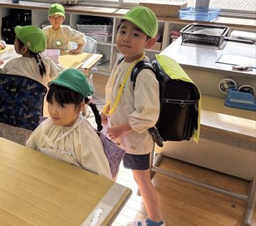 一年生の教室では絵本の紹介を聞いたり、実際にランドセルを背負わせてもらうことができました。そして、元気に「おはようございます!」の挨拶もしてみました。他にも、一年生が育てているチューリップの水やりや折り紙、すごろくをしたりしました🎲