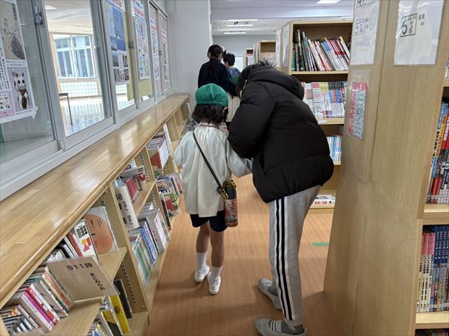最初に校長先生のお話を聞き、5年生のお兄さん、お姉さんと学校探検をしました。グループで自己紹介をした後、首に”がっこうたんけんカード”掛けてもらい、家庭科室や音楽室など様々な教室を案内してくれました。