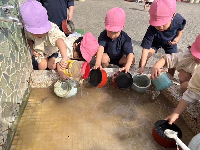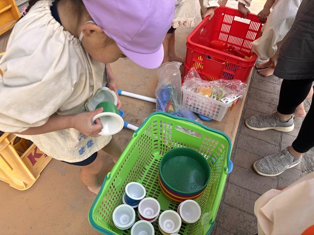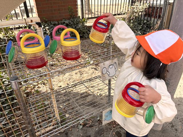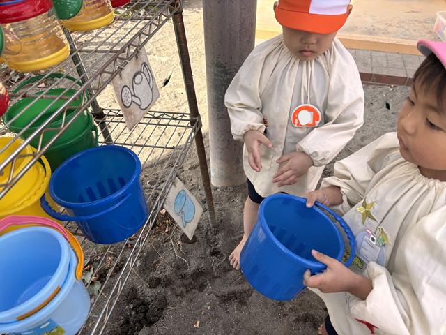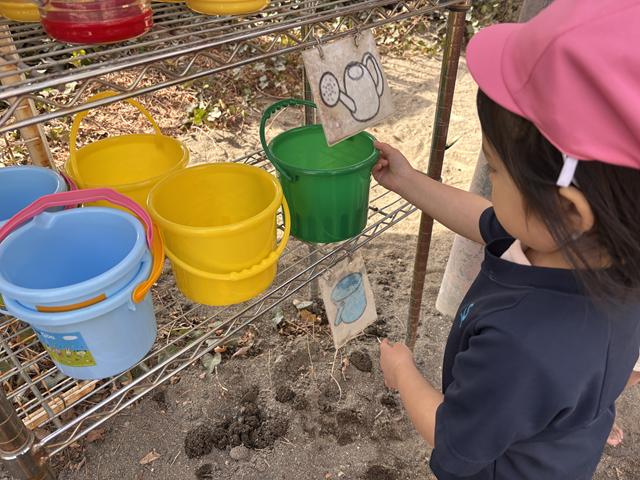 今までたくさん遊んできたこともあり、「バケツの砂は出してからお片付けだよ!」「ジョーロに、お砂は入れたら、お水出なくなっちゃうよね!」と言葉にする姿がありました。