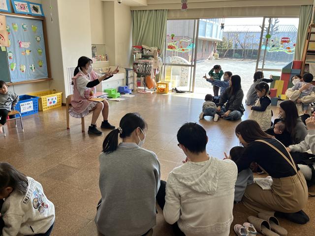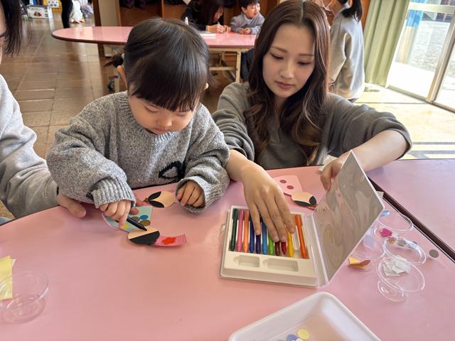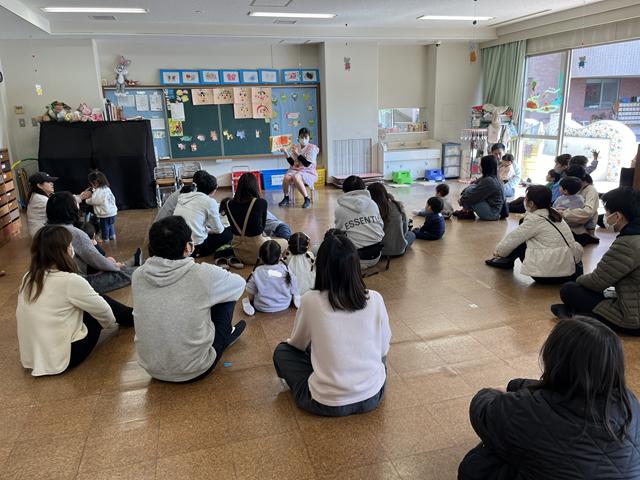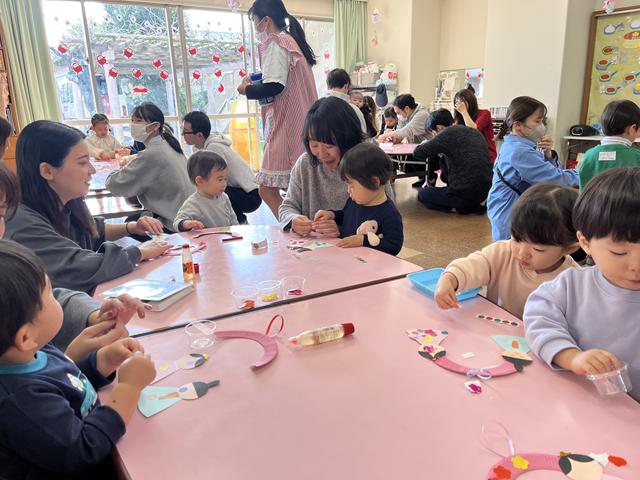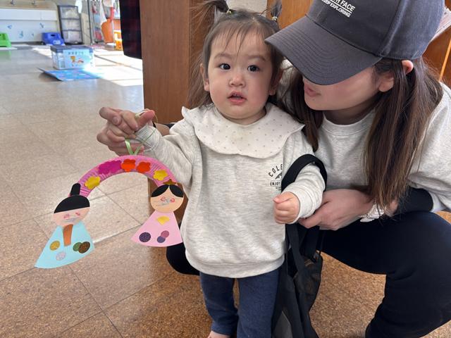製作の後はお集まりをして「手をたたきましょう」「おもちゃのチャチャチャ」「うれしいひなまつり」「おはようの歌」を歌いお名前呼びをして絵本を見ました。