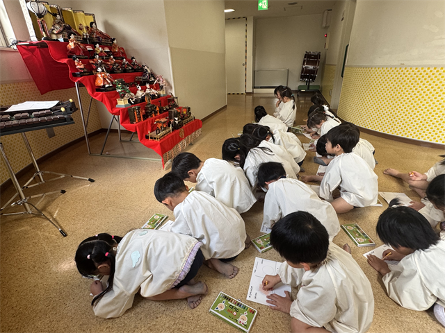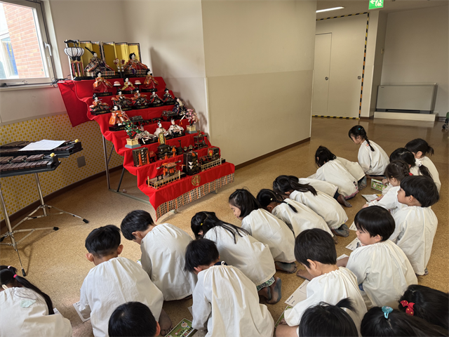 幼稚園には玄関ホールと遊戯室前の2か所におひなさまが飾られています。