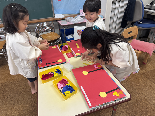 描いたものや折ったものを組み合わせながら製作帳にのりで貼り、完成です✨