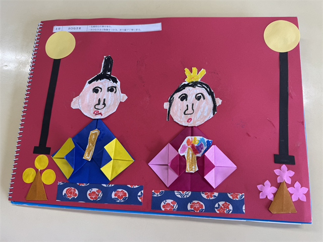 保育室では、折り紙でお内裏様とお雛様の体や、周りに飾る桃と橘の木を折りました。