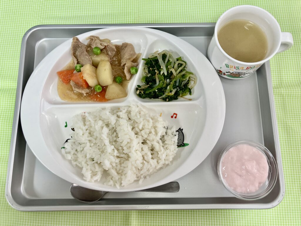 ごはん・大根の味噌汁・肉じゃが・ほうれん草のごま和え・いちごフルーチェ