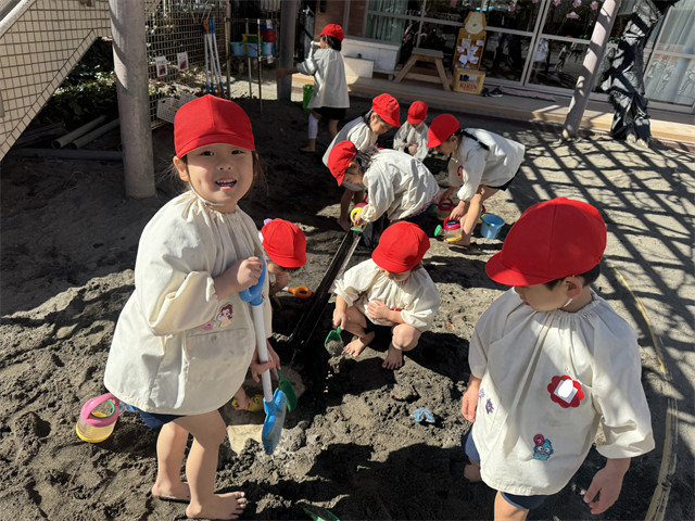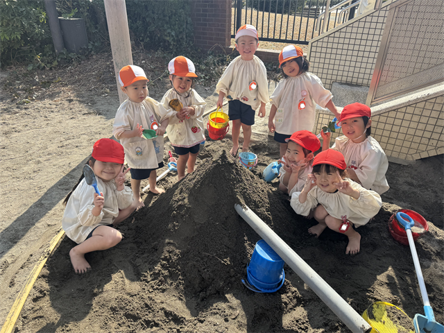 満3歳児 パンダ組のお友だちと一緒に、砂場で大きな山を作って楽しむ姿も見られました🌟