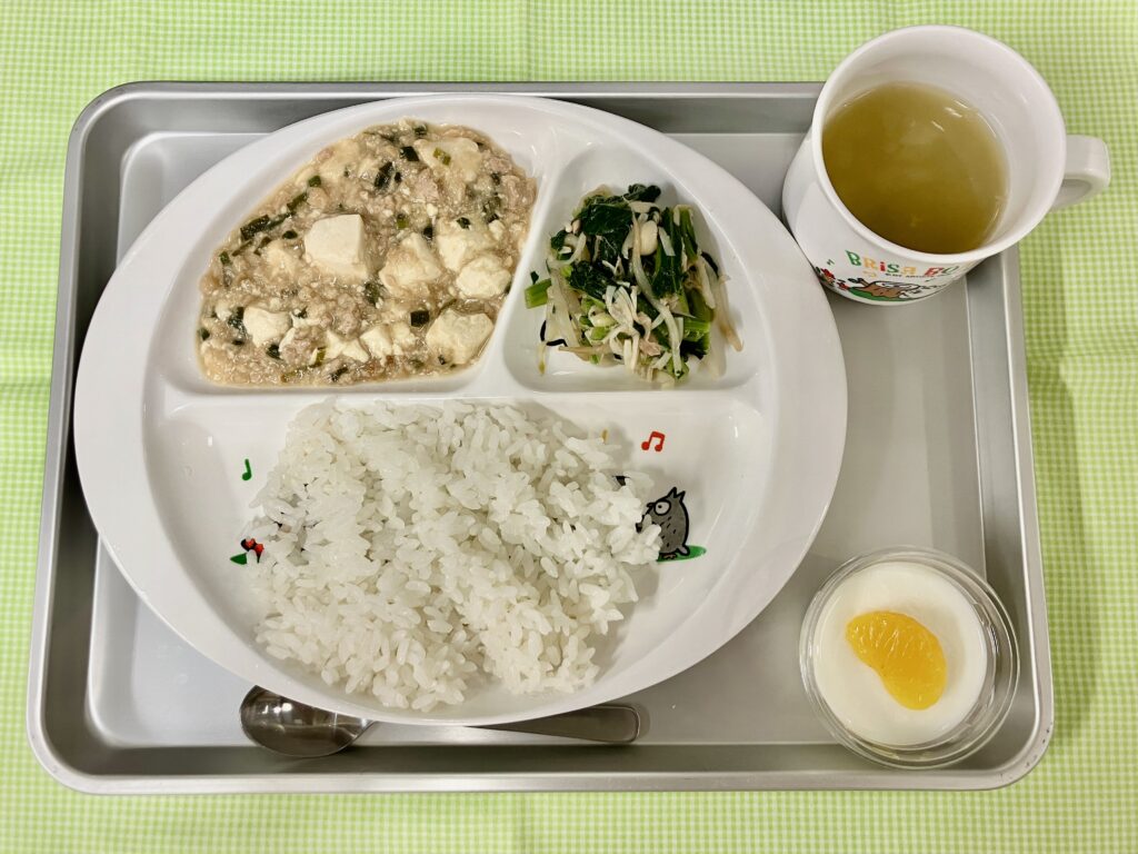 ごはん・中華風コーンスープ・マーボー豆腐・小松菜とえのきの中華風和え物・杏仁豆腐