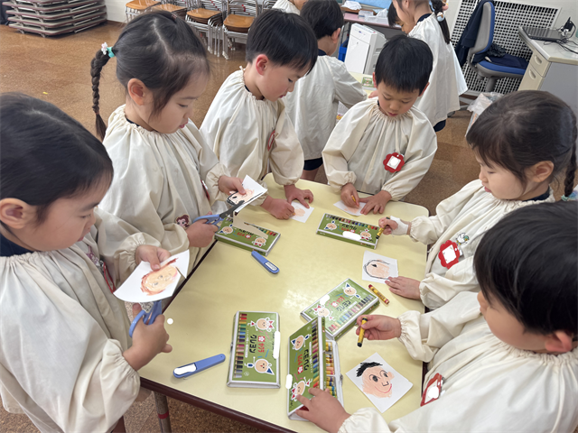 招待状には、ひとりひとりが自分の顔を描き、はさみで切りました🖍