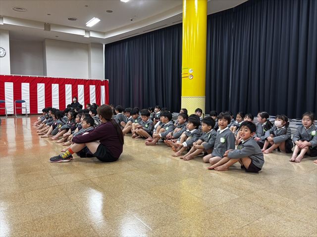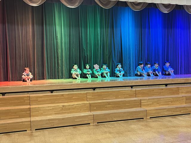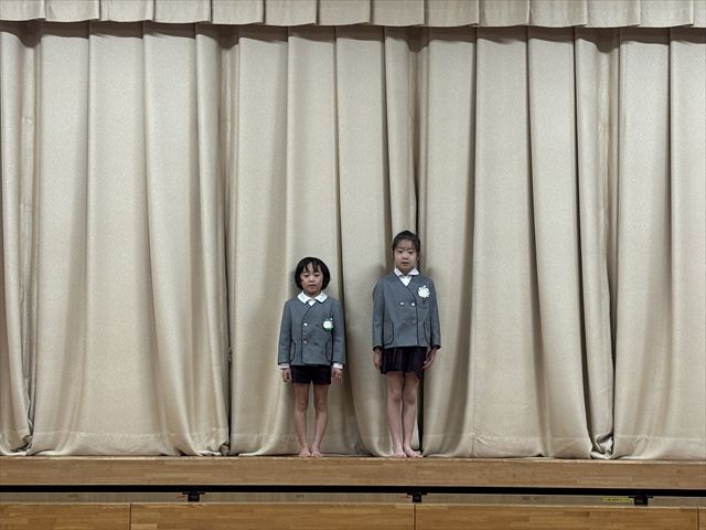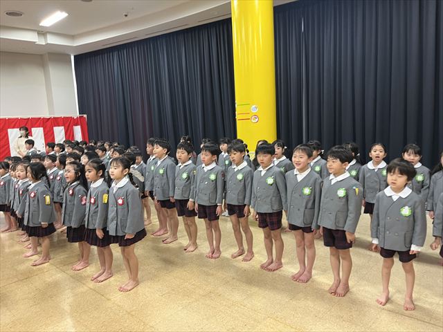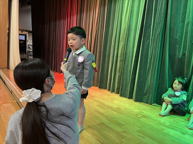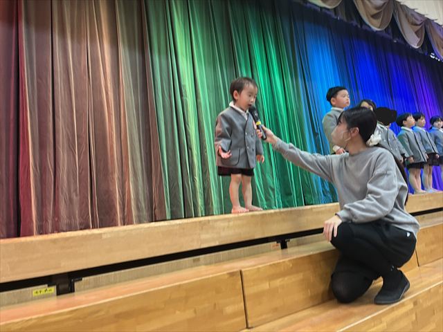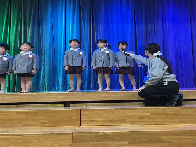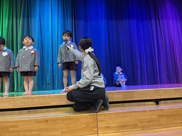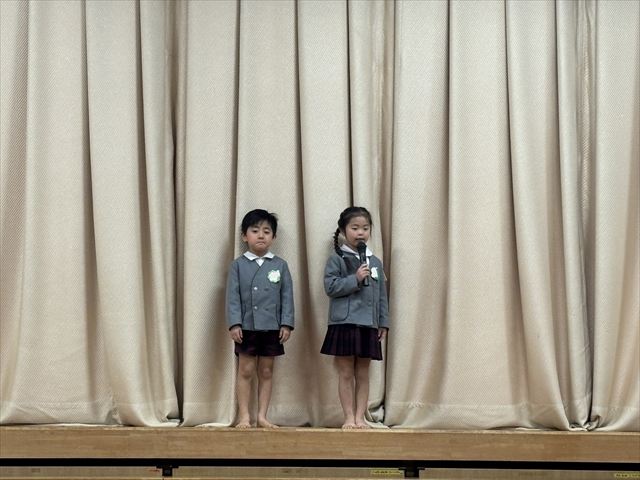 松組のお友だちのはじめの言葉で会が始まると、幕が上がり緊張した顔で座っている3月生まれのお友だちがいました。