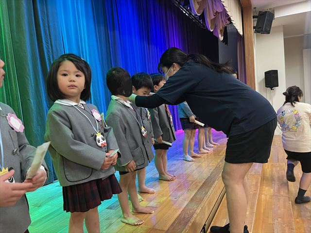 担任の先生から名前を呼ばれると大きな声で返事をし、パンダ組・桜組のお友だちは『好きな食べ物』、梅組・松組のお友だちは『大きくなったらなりたいもの』を発表しました。ぶどうにいちご、アイスクリーム屋さんにユーチューバー、一人ひとりが自分の言葉で言えることができましたね。