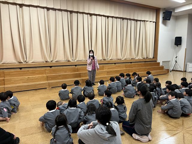 「誕生会のうた」「さんぽ」の歌を歌ったり、副園長先生からのお話も聞きました。話の聞き方もとても上手になりました。