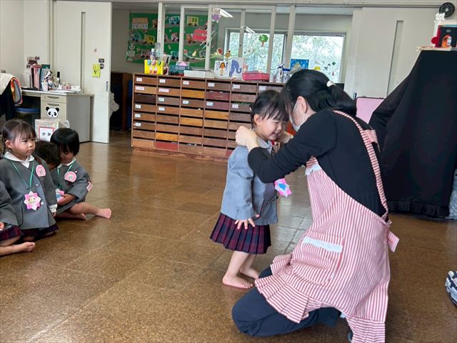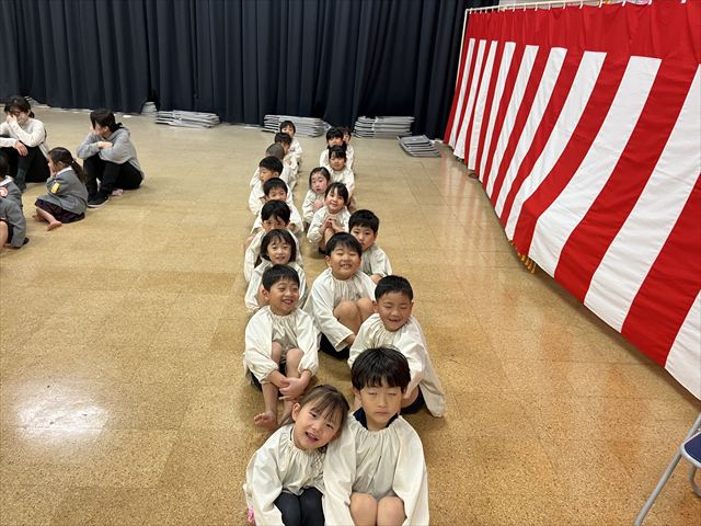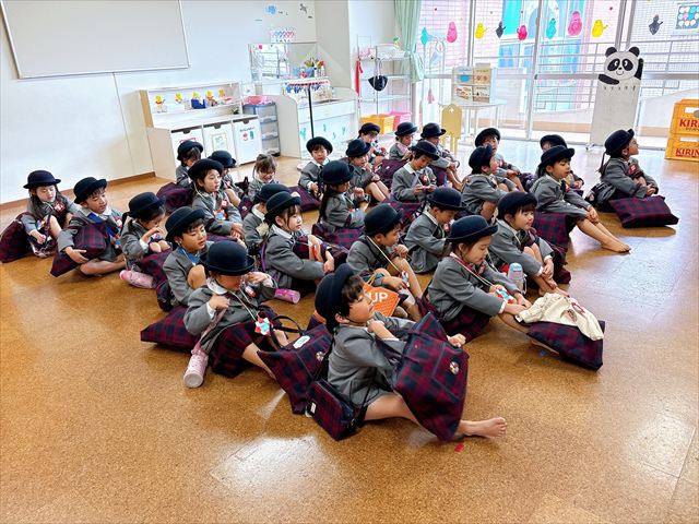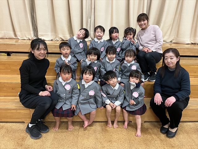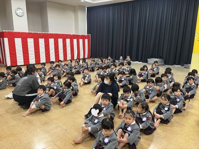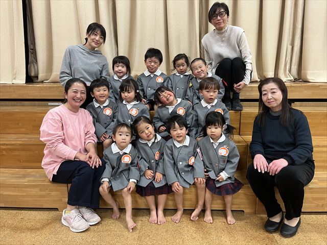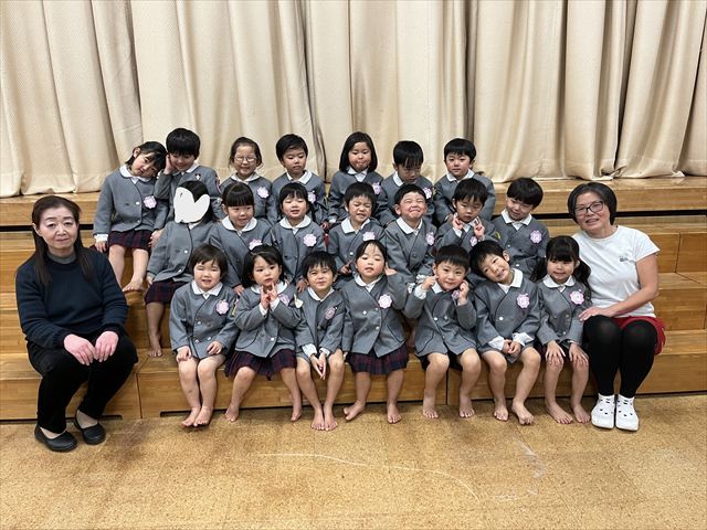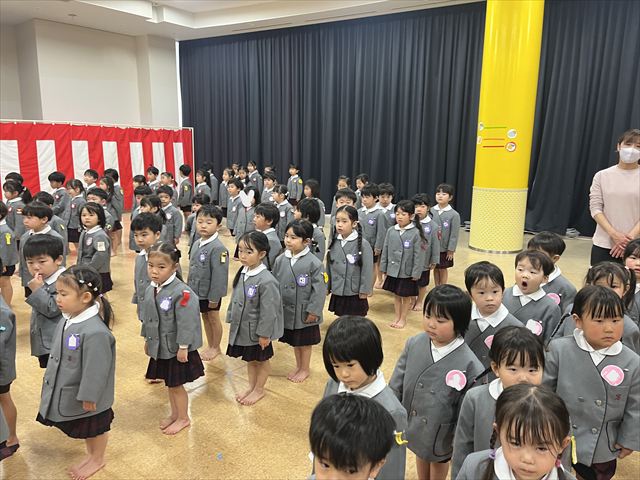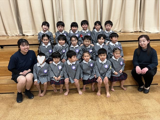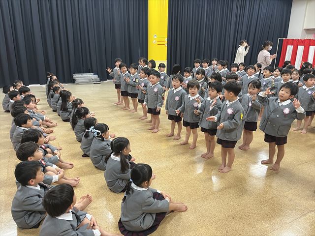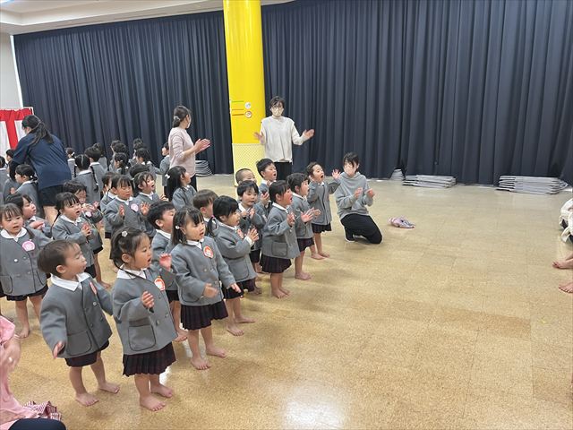 パンダ組、桜組、梅組のお友だちが集まり「いろいろなことに挑戦し、お友だちと楽しく過ごした一年間が終わり、ひとつお兄さん、お姉さんになりますね」と話を聞いたり、それぞれの学年で思い出の歌を歌いました。