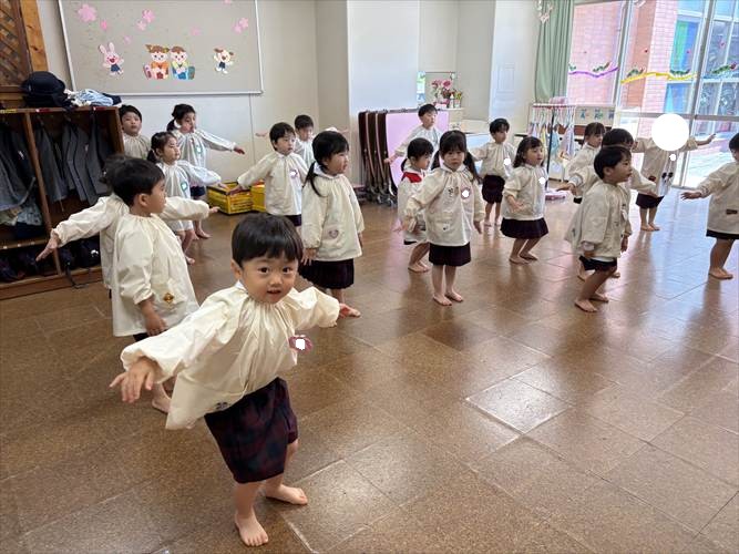 そして先生方からも「むすんでひらいて」「トントントントンあんぱんまん」の手遊びのプレゼントがあり、遊戯室でいろいろな歌を歌い楽しく過ごしました。