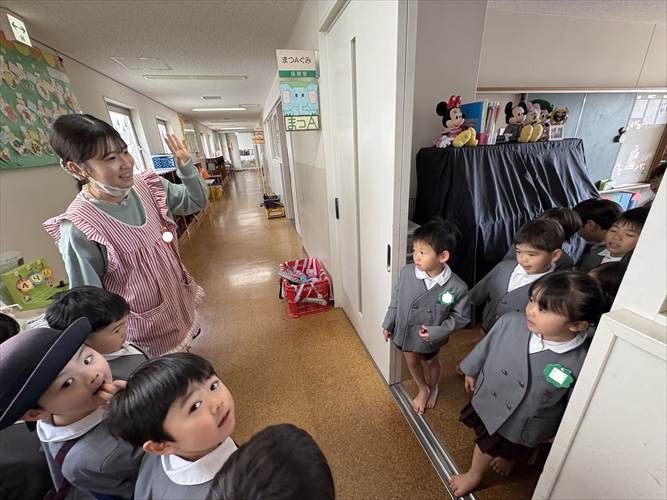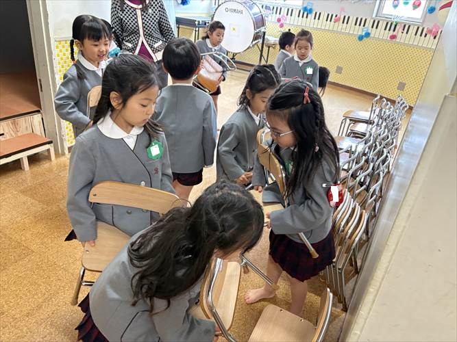 うめぐみ・まつぐみはその後椅子の持ち方を確認し自分たちで片付け、また園内巡りも行いました。