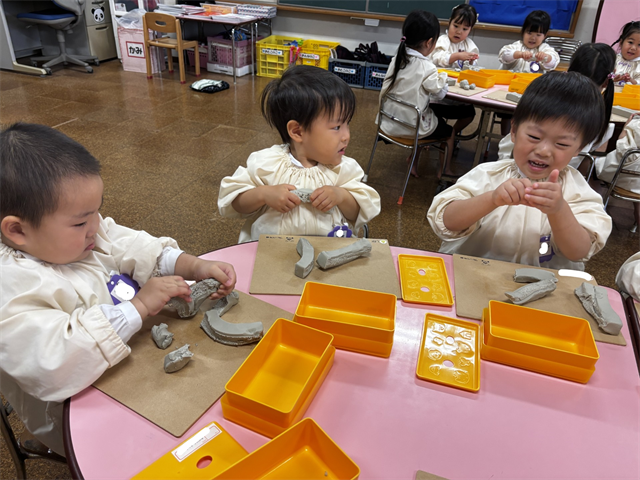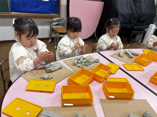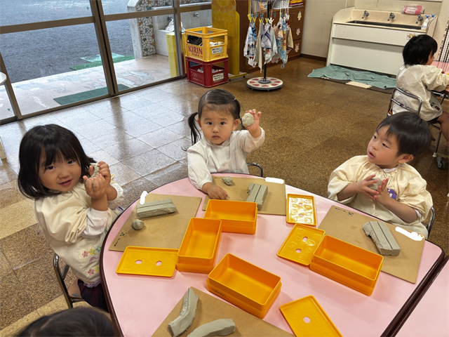 粘土の感触を楽しみ、こねたり丸めたりしながら楽しみました。