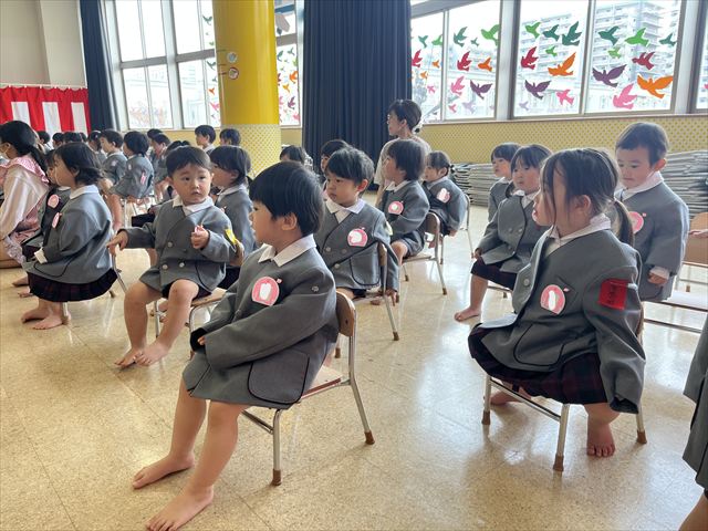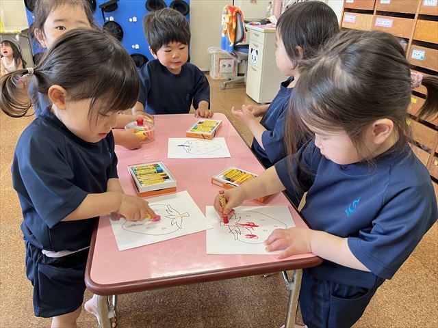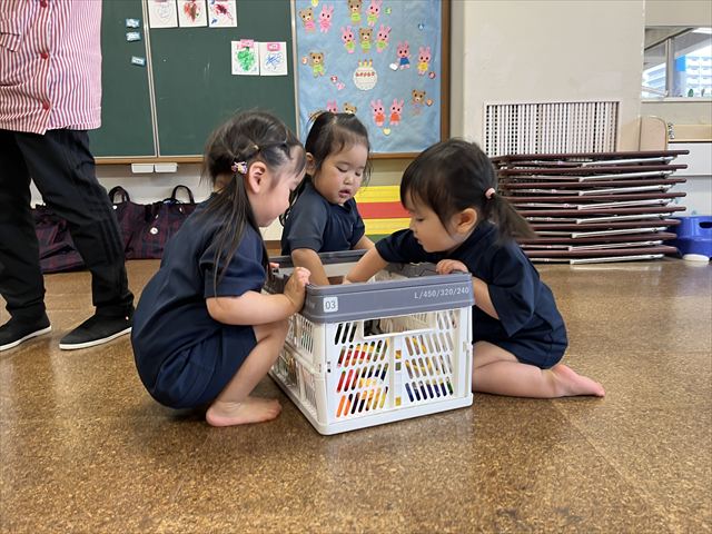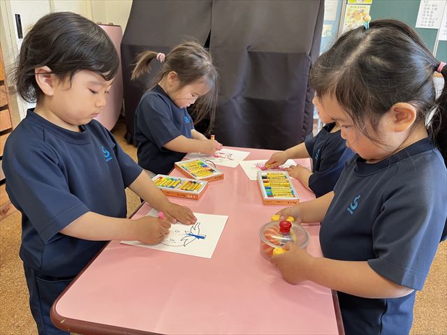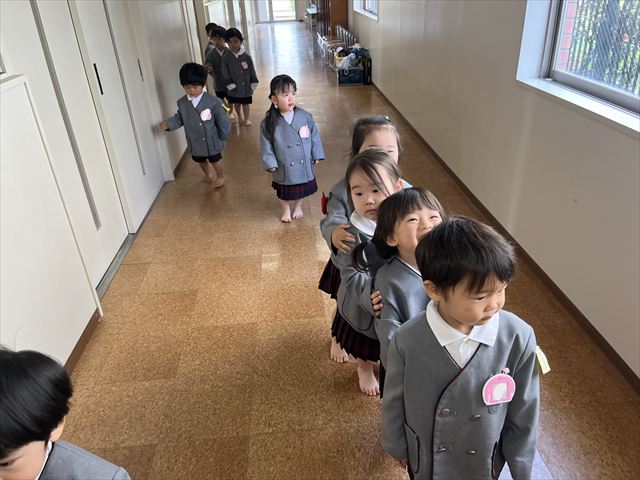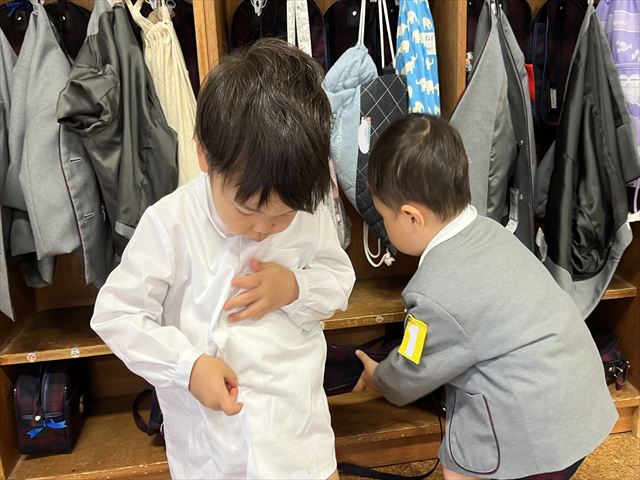 今週月曜日に入園式を迎えた満三歳児パンダ組のお友だち。翌日火曜日からは、おうちの方と離れて園生活を送っています。一日ごとに幼稚園に慣れてきて、玄関で泣いていてもお部屋に来ると泣き止むようになりました。今はまだ朝の支度や着替えを先生と一緒に行っていますが、これから少しずつ自分のマークを覚え、朝の支度や着替えも一人でやってみようとする気持ちが芽生えてくると思います。一人ひとりの気持ちを受け止め、寄り添った援助を毎日繰り返し、経験を積み重ねながら基本的生活習慣の自立や様々な活動に参加する意欲を高めていきたいです。