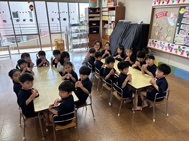 ピアノに合わせて「給食の歌」を歌い、「いただきます」のご挨拶をしました。