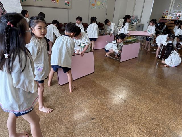 来週(20日)から始まる本給食に向けて椅子の座り方の指導を行い、美味しくいただけるよう援助しています。手を洗い、椅子を準備し、松組さんは自分たちで机の準備も行います。