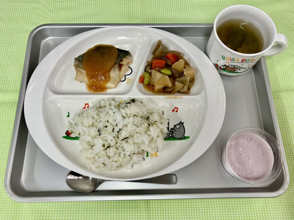 菜めし・オクラのすまし汁・鯖の味噌煮・筑前煮・ブルーベリーヨーグルト