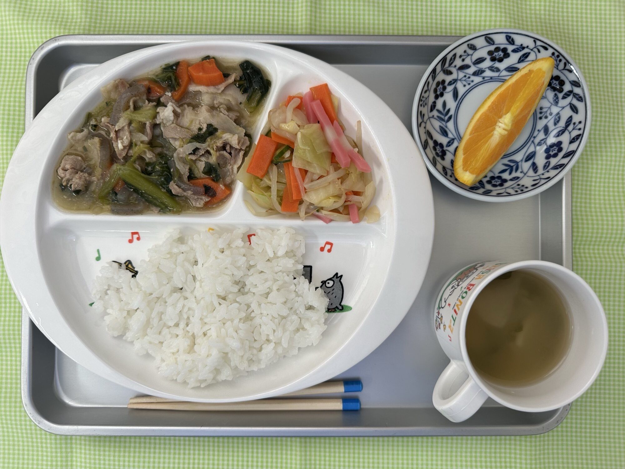 ごはん・大根の味噌汁・豚肉のうま煮・かまぼこサラダ・オレンジ
