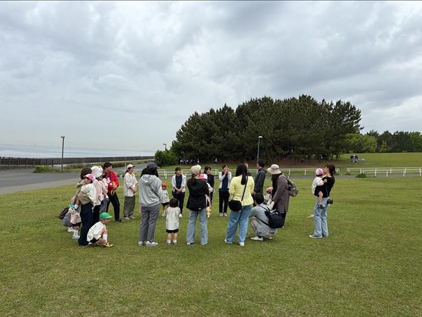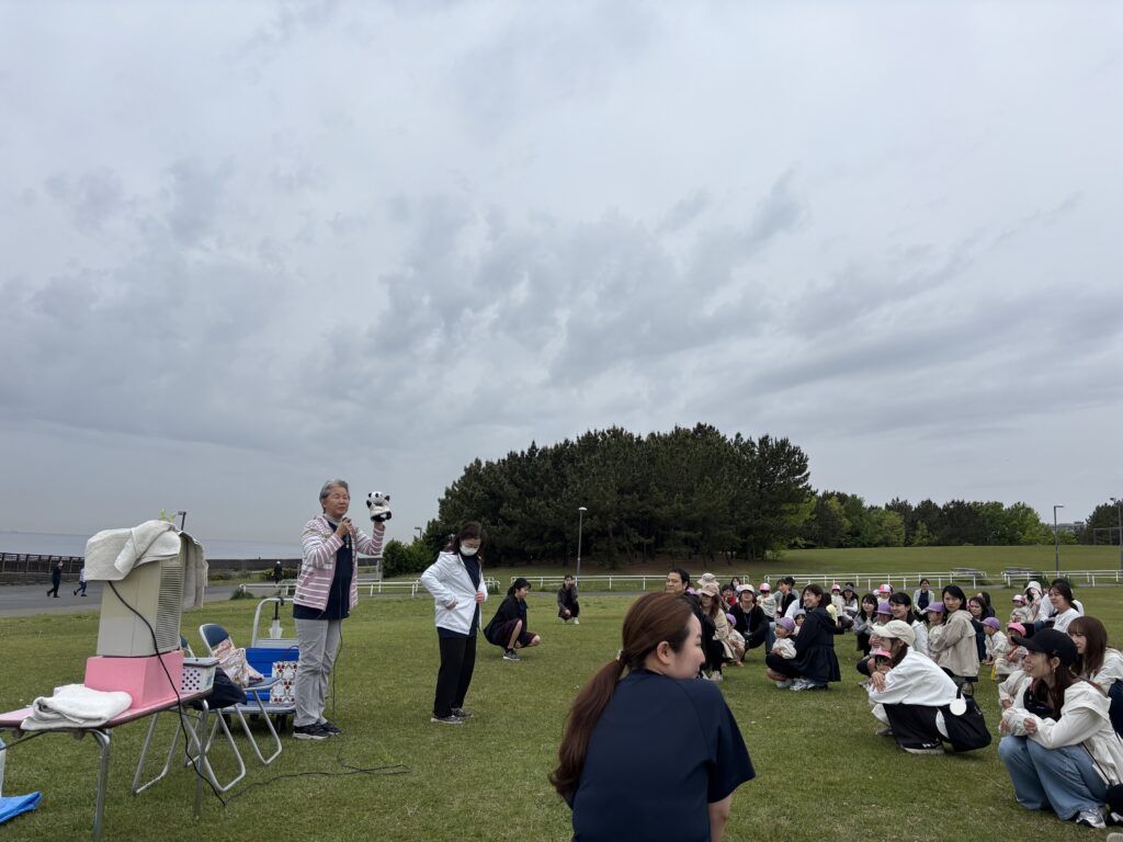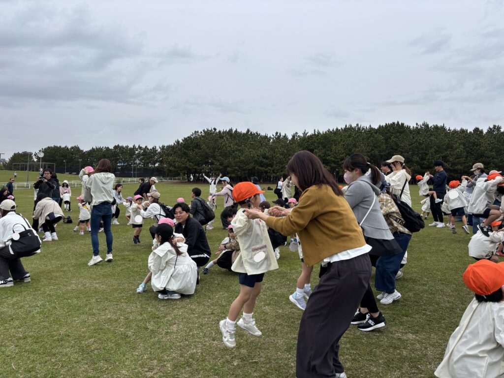 海風があり、少し肌寒く感じましたが、園長先生の話を聞き、みんなで『ダンスリトルバード』のフォークダンスをしているうちに肌寒さも忘れるほどお家の方と楽しく踊ることができましたね♪