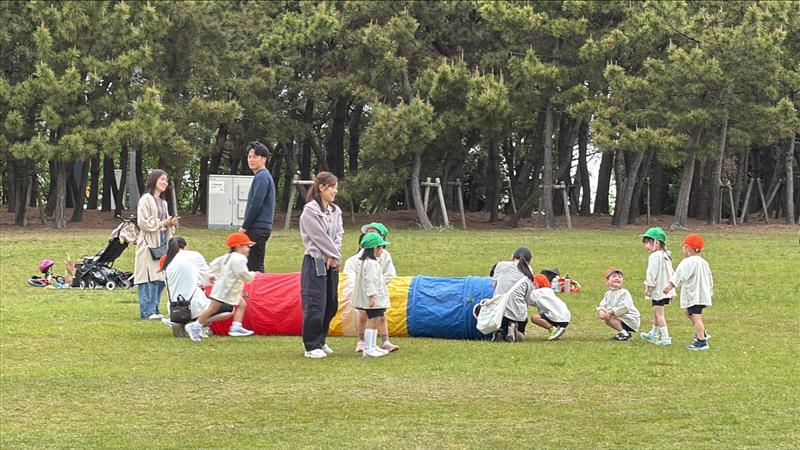 ファニートンネルやボール、長縄、鬼ごっこで楽しく遊んでいると・・・ポツポツポツ雨が降ってきたため、急遽、解散となりました。
