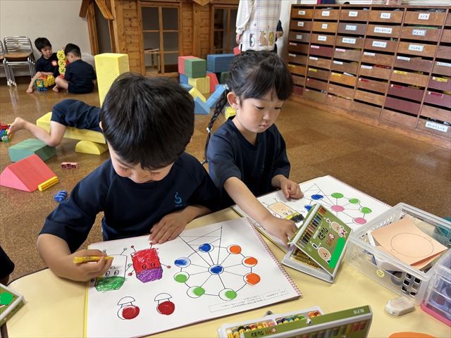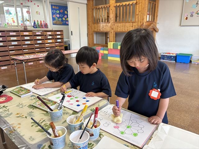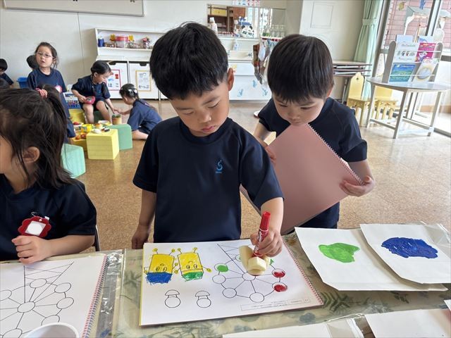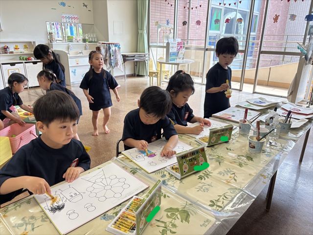 毎日元気いっぱいの梅組さん。4月の製作では、絵の具を使ってたんぽ遊びをしました。好きな色を選び、製作帳にぺったん🌼クレヨンのくろくんは、クレヨンを使って好きなように塗りました。