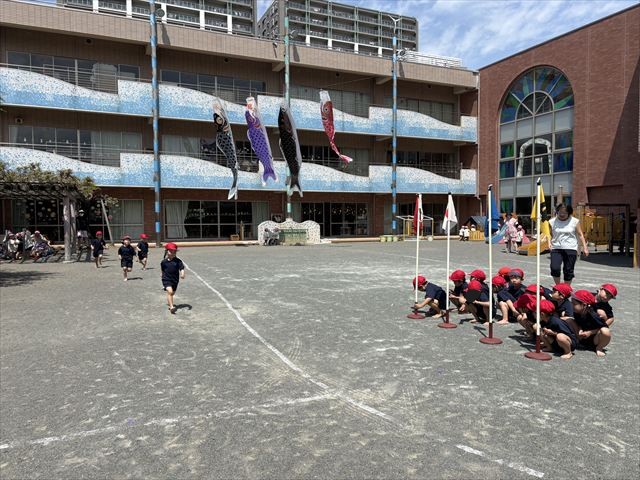 戸外ではトラック一周を行進をしたり、自分たちで4人組を作り、かけっこもしています。最後まで諦めずに、ゴールをめざして一生懸命走る姿がみられています⭐