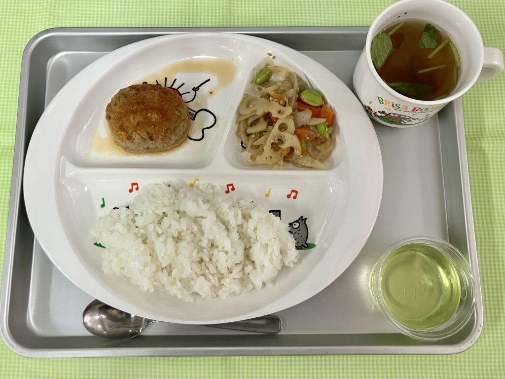 ごはん・みつばのすまし汁・和風ハンバーグ・きんぴらごぼう・青りんごゼリー